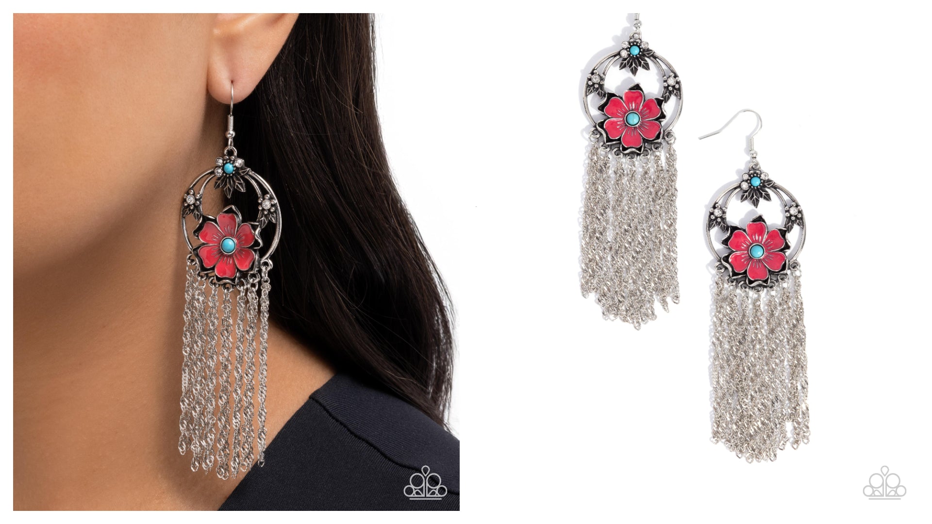 Featuring white rhinestones and round turquoise stones, a collection of whimsical leaves sporadically dots along a layered silver hoop, leading the eye to a Winter Berry-painted three-dimensional silver flower with a turquoise stone center. Classic and Singapore silver chains stream from the bottom of the floral fitting for a free-spirited, flashy finish. Earring attaches to a standard fishhook fitting. As the stone elements in this piece are natural, some color variation is normal.