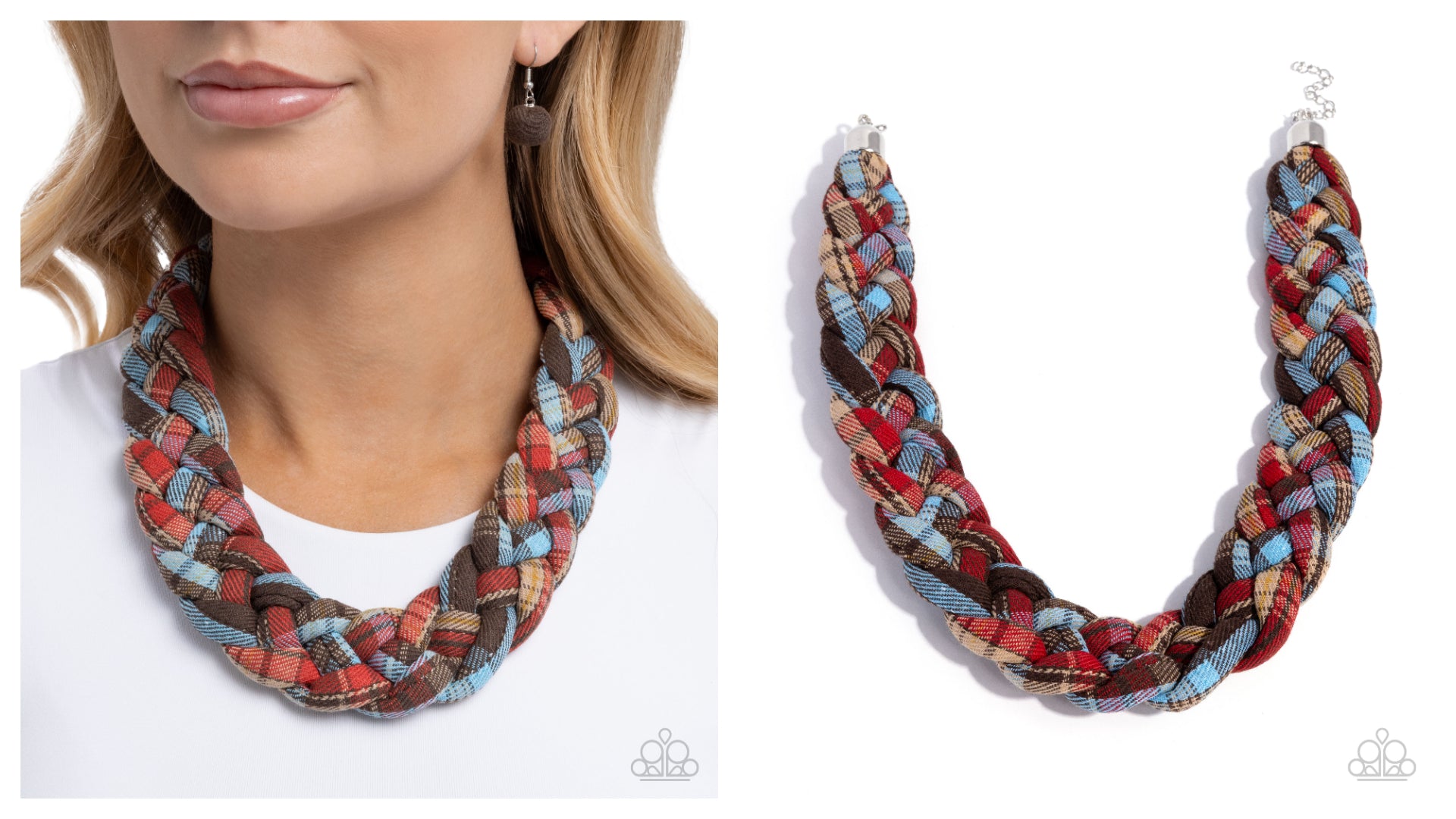 Emerging from silver cap fittings, thickly-braided brown flannel fabric coalesces around the neckline for a rustic pop of color and flair. Features an adjustable clasp closure.