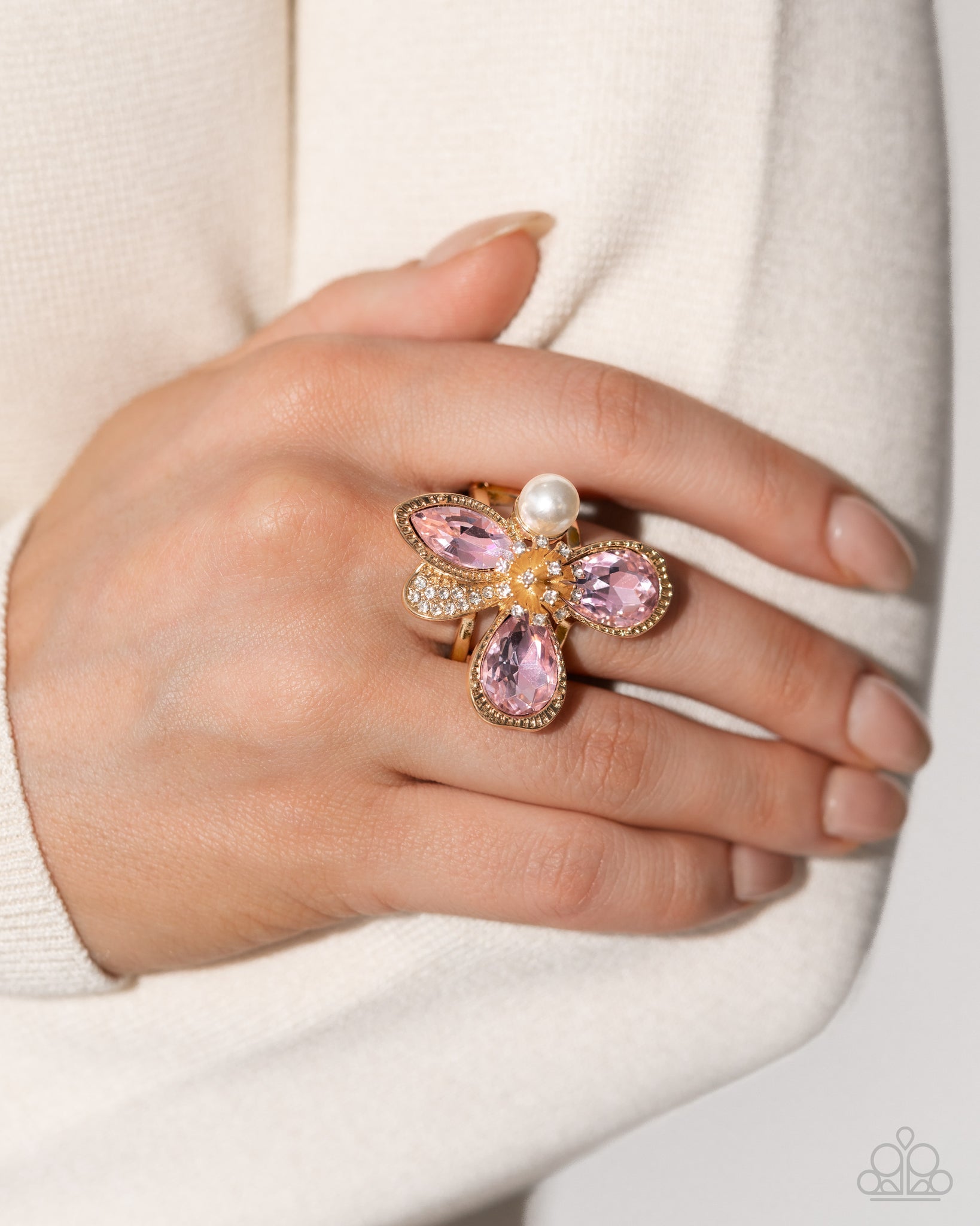 Featured atop an airy gold band, an abstract gold flower, featuring teardrop and marquise-cut pink gems, white rhinestones, and white pearl petals flutters. Additional dainty white rhinestones create realistic anther-inspired dazzle from a gold filament center for a refined finish. Features a stretchy band for a flexible fit.