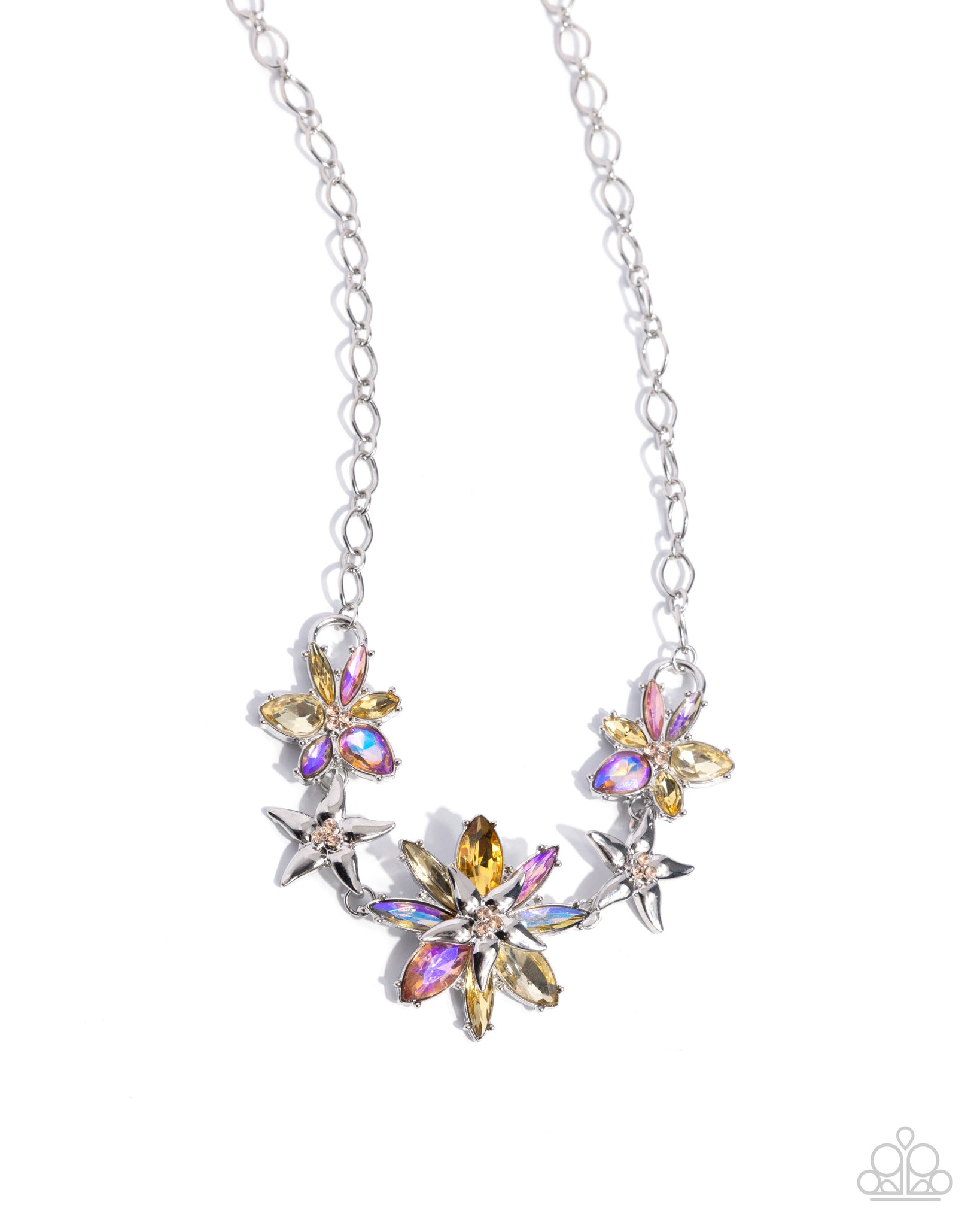 Necklace: Featuring a three-dimensional effect, a collection of yellow multicolored and yellow UV-shimmery gem flowers made up of marquise-cut and teardrop silver-pronged petals blooms from a trio of light peach rhinestones in varying sizes, alternating with tilted silver flowers with similar shimmery centerpieces below the neckline along an abstract silver chain for a fantastically floral look. Features an adjustable clasp closure.