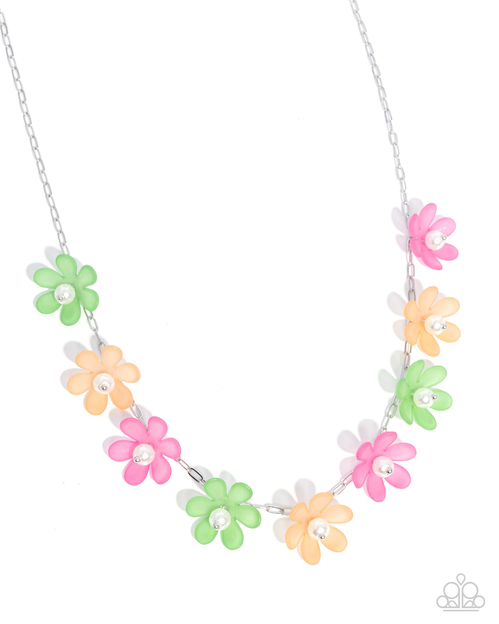 Necklace: Dotted with white pearly centers, dainty sea glass-like pink, orange, and light green flowers bloom across a dainty silver paperclip chain along the collar, invoking a festive spirit. Features an adjustable clasp closure.