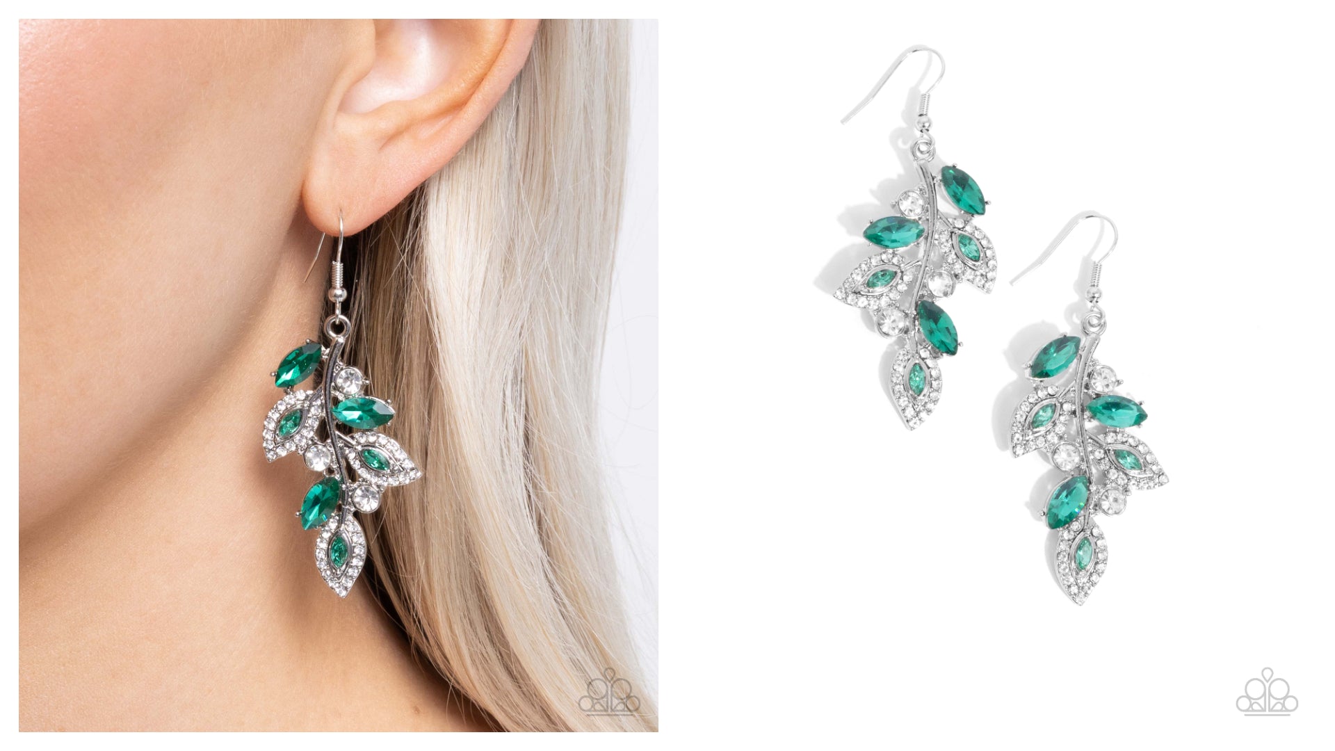 Cascading from a thin silver vine, a collection of emerald marquise-cut gem leaves, white rhinestone-bordered emerald marquise-cut leaves, and round white gems twinkles from the ear for a whimsical look. Earring attaches to a standard fishhook fitting.