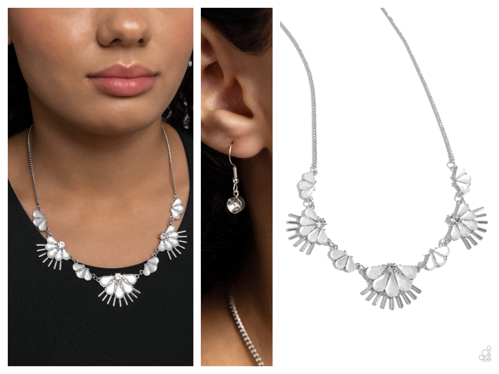 Three milky white teardrops, set in dainty pronged fittings, alternate with solitaire white rhinestones that give way to a cluster of larger milky white teardrops. Sleek silver bars flare out from the exaggerated teardrop display creating a fan-like arrangement along the neckline for a sense of refinement. Features an adjustable clasp closure.