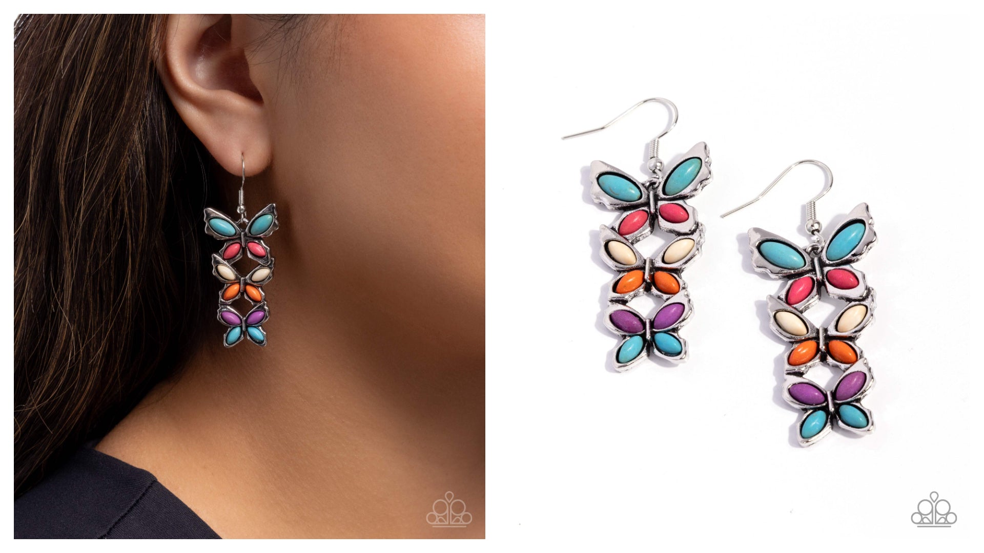 Stacked silver butterfly frames are inlaid with marquise-shaped stones in a vivid mix of turquoise, pink, orange, purple, and ivory, creating a colorful flight of whimsy. The vibrant, southwestern-inspired palette adds eye-catching contrast as the cascading butterflies swing from a standard fishhook fitting. As the stone elements in this piece are natural, some color variation is normal.