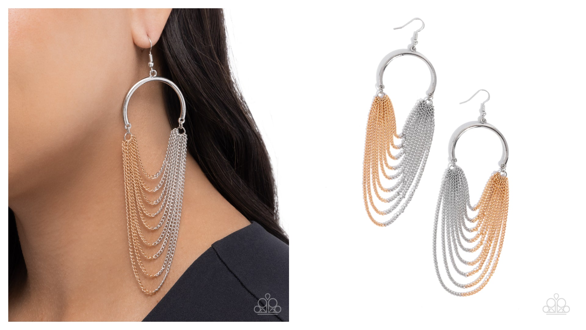 Gathered rows of half-dipped gold and silver chains cascade from the bottom of a shiny silver arch, creating a glamorously glitzy fringe. Earring attaches to a standard fishhook fitting.