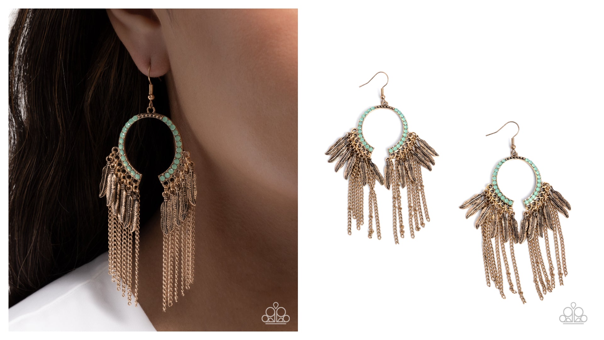 An open-ended circle features a ring of opal-like green rhinestones and antiqued gold studs as it sways from the ear. A cascade of textured gold feather charms and glistening chain fringe fans out below, creating a dynamic and eye-catching look. Earring attaches to a standard fishhook fitting.