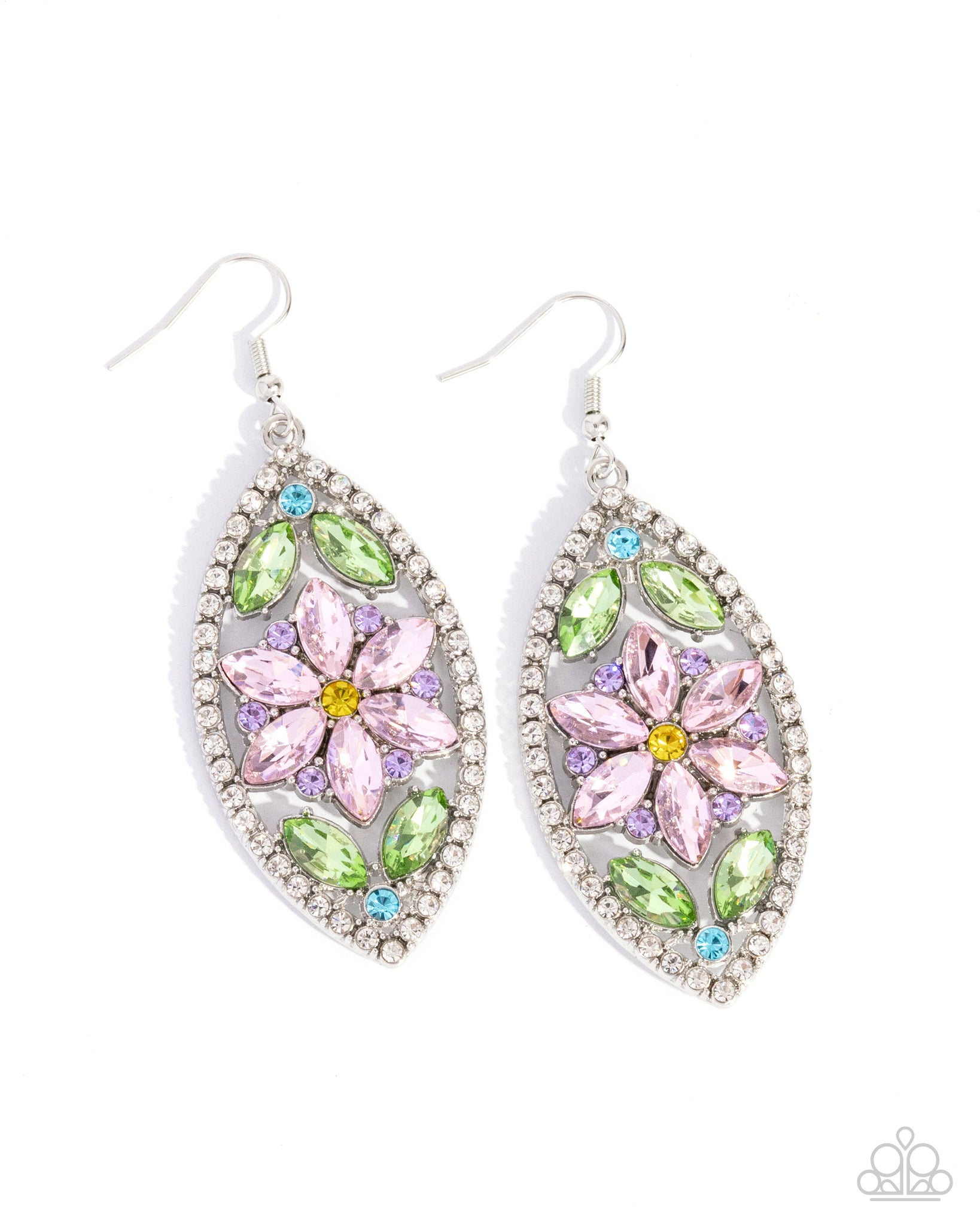 Pronged along the inner surface of an airy silver teardrop, a collection of green marquise-cut gem leaves bloom from solitaire aquamarine rhinestones while a yellow rhinestone-centered pink marquise-cut gem flower is featured in the center. Violet rhinestones frame around the pink flower for a touch of eye-catching radiance while the teardrop frame itself is bordered in white rhinestones for a sparkly finish. Earring attaches to a standard fishhook fitting.