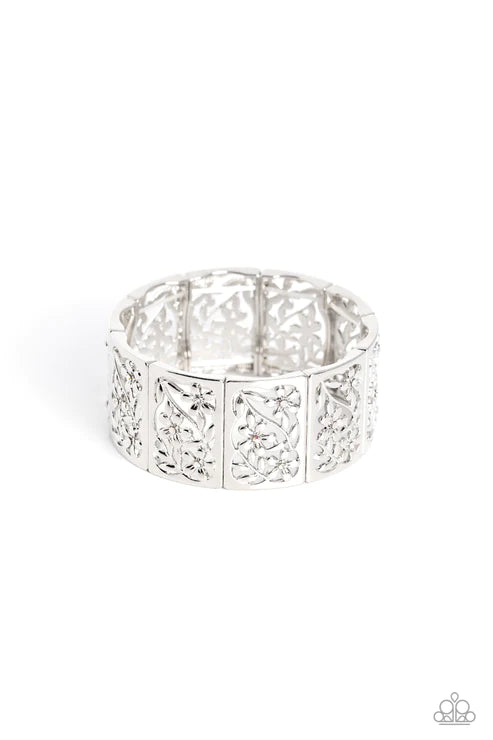 Sleek silver frames, filled with whimsical leafy floral filigree and opalescent, white, and iridescent rhinestones, stack around the wrist on an elastic stretchy band for a dainty handcrafted statement. Due to its prismatic palette, color may vary.