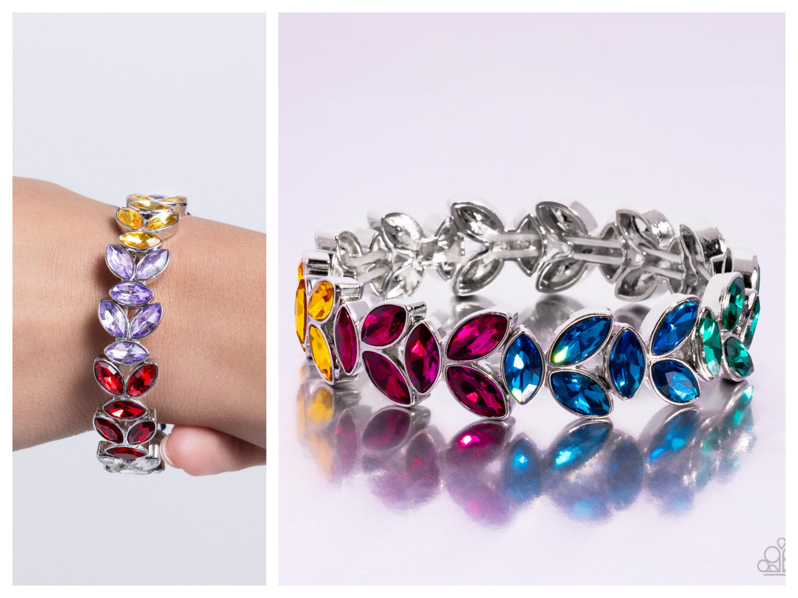 Trios of elegant marquise multicolored rhinestones delicately join into leafy silver frames along a stretchy band, creating a refined display around the wrist.