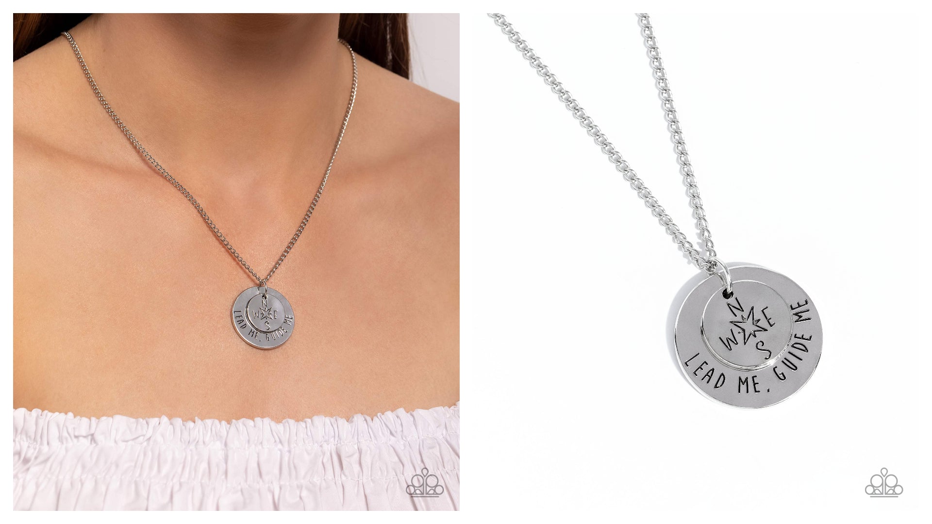 Two varying sizes of interconnected silver discs brushed in an antiqued grit swing below a classic silver chain. The oversized disc features the phrase "Lead Me, Guide Me" as the font curves up around the upper disc. The smaller, uppermost disc is stamped with a simple compass design, following its inspirational motif. Features an adjustable clasp closure.