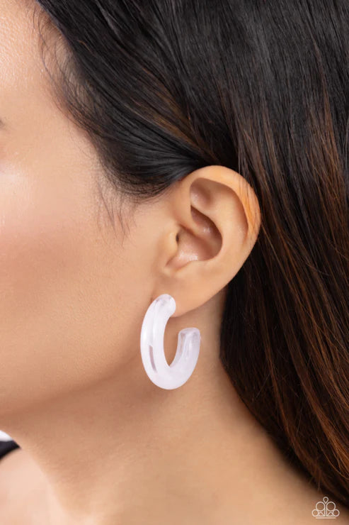 Thick, milky white acrylic frames snugly loop and curl just below the ear for a fashionable finish. Earring attaches to a standard post fitting. Hoop measures approximately 1 1/2" in diameter.