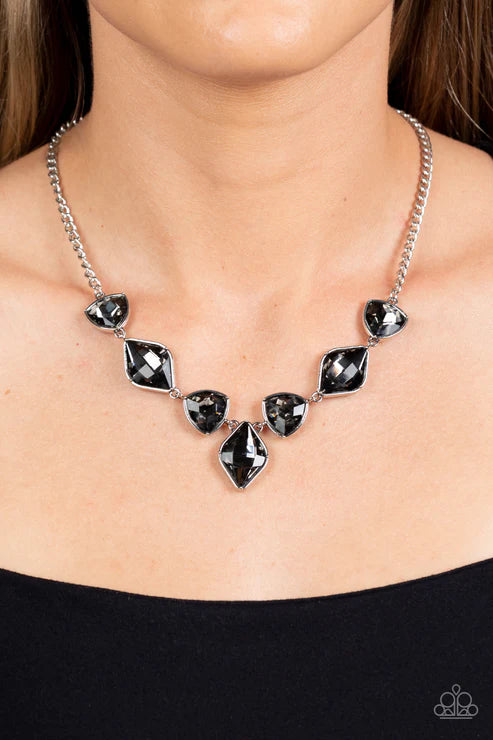 Set in silver frames, glittering geometric shapes with a smoky shimmer delicately coalesce around the collar for a statement piece. Features an adjustable clasp closure.