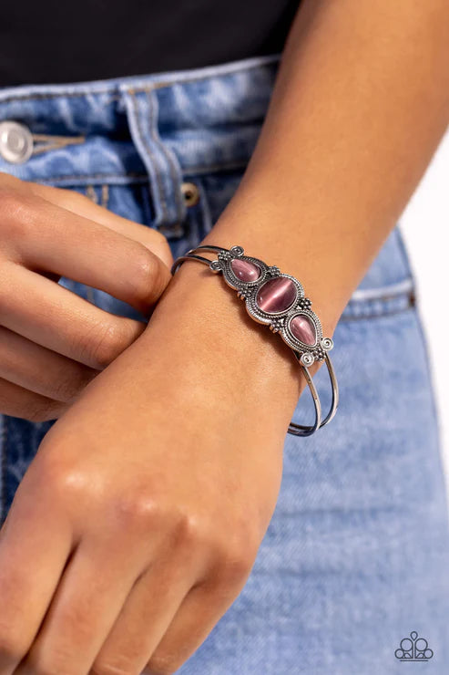 Oval and teardrop purple cat's eye stones adorn a frilly silver frame adorned in studded floral accents, creating a whimsical centerpiece atop a daintily layered silver cuff.