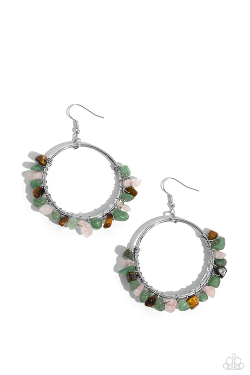 A colorful collection of chiseled jade, rose quartz, and tiger's eye stones are wrapped along the bottom of a shiny, silver hoop by shimmery silver wire for a handcrafted, earthy finish. Earring attaches to a standard fishhook fitting. As the stone elements in this piece are natural, some color variation is normal.