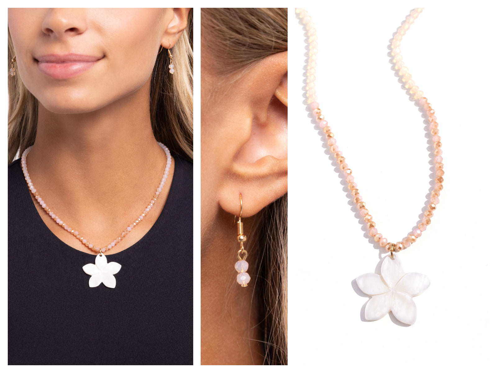 Infused along an invisible string, a collection of faceted pink shimmery beads loop around the neckline. A white shell flower, resembling a Hawaiian flower glides along the beaded collection for a whimsical finish. Features an adjustable clasp closure.