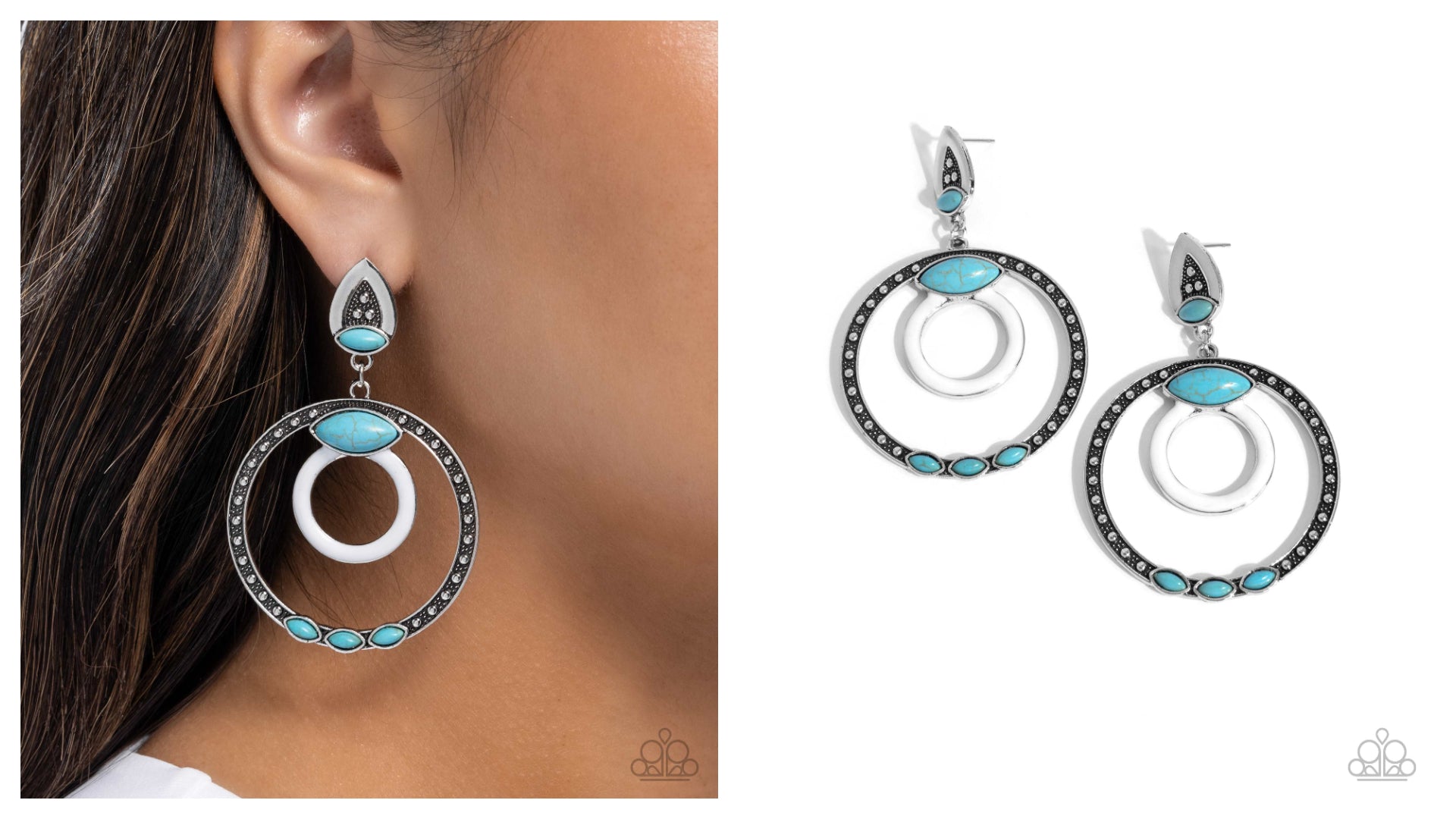 Pressed in a silver teardrop, a trio of silver studs stands out atop a tilted marquise-cut teardrop stone giving way to a duo of concentric silver circles also embellished in silver studs and tilted marquise-cut turquoise stones. The innermost circle features a vibrant spot of white paint for a rustic radiant display. Earring attaches to a standard post fitting. As the stone elements in this piece are natural, some color variation is normal.