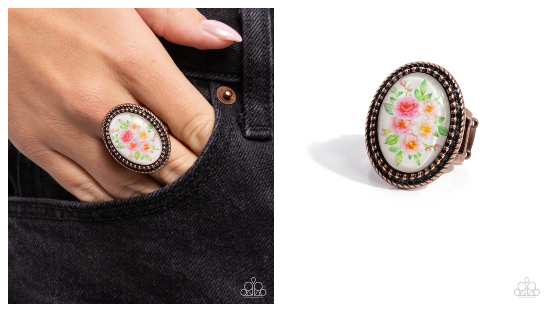 Pressed in a rope-textured copper frame, a blooming collection of pink roses is featured atop a white-painted frame for a whimsical centerpiece. Features a stretchy band for a flexible fit.