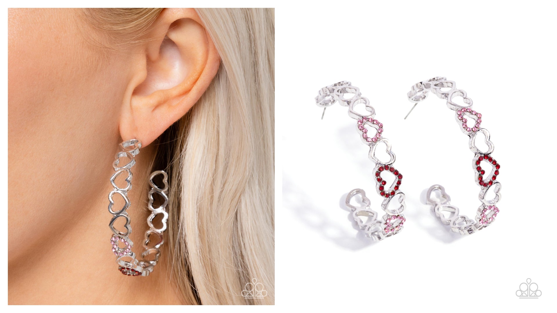 A collection of silver heart silhouettes, some embellished in pink and red rhinestones, alternate in direction along the ear for a shimmery sweet look. Earring attaches to a standard post fitting. Hoop measures approximately 2" in diameter.