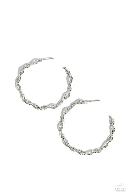 Textured silver bars delicately twist into a glistening helix, creating an edgy oversized hoop. Earring attaches to a standard post fitting. Hoop measures approximately 2" in diameter.