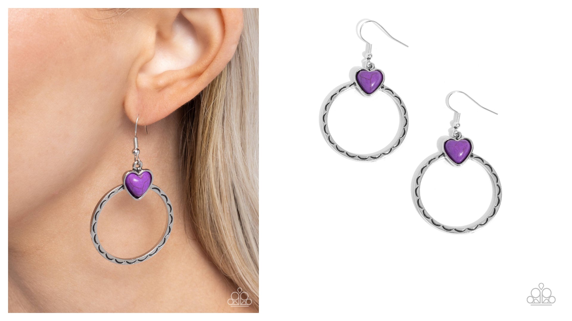 Stamped in a scalloped pattern, a classic silver hoop attaches to the bottom of a playful purple stone heart frame, creating an earthy pop of color. Earring attaches to a standard fishhook fitting. As the stone elements in this piece are natural, some color variation is normal.