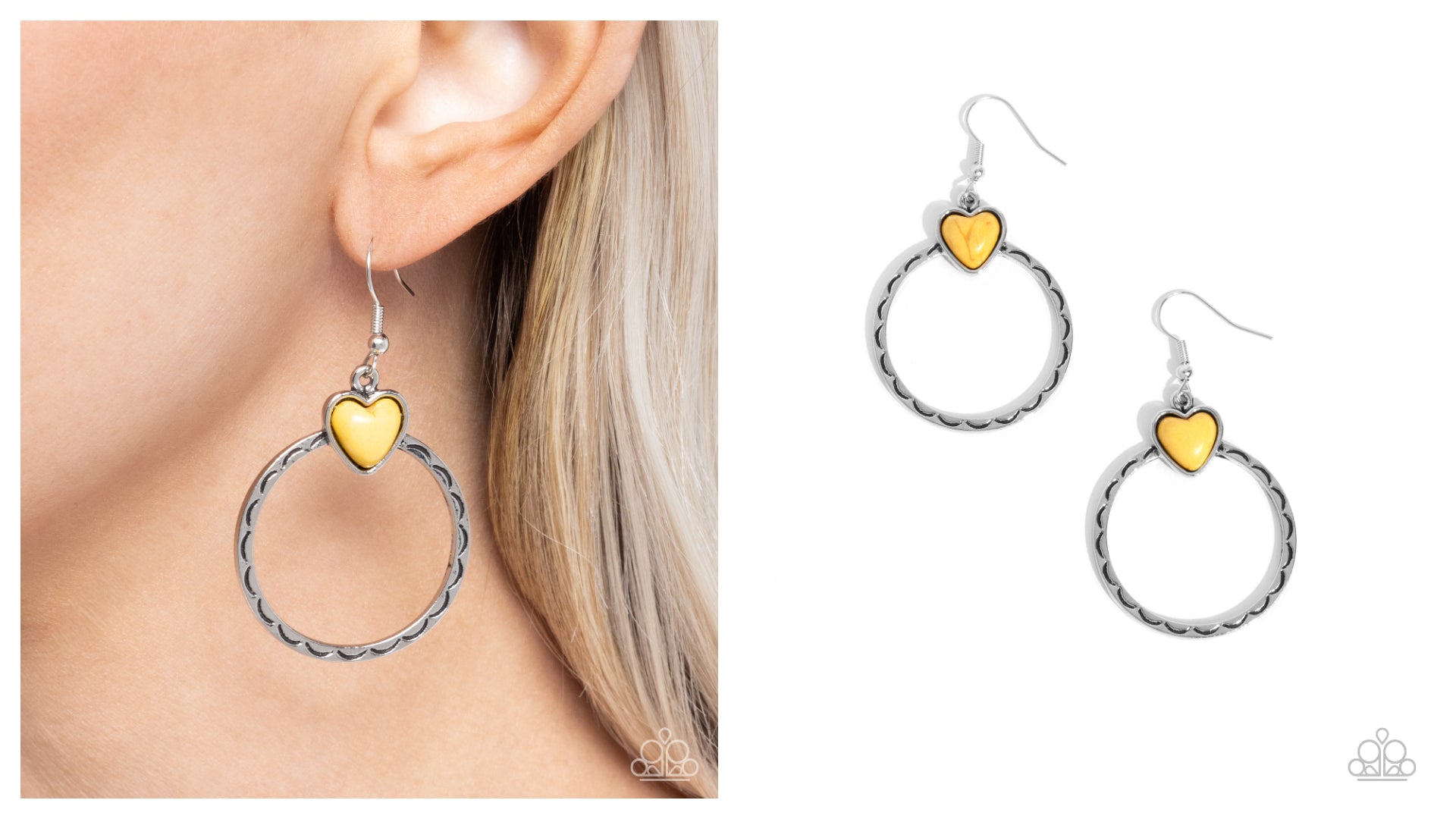 Stamped in a scalloped pattern, a classic silver hoop attaches to the bottom of a playful yellow stone heart frame, creating an earthy pop of color. Earring attaches to a standard fishhook fitting. As the stone elements in this piece are natural, some color variation is normal.