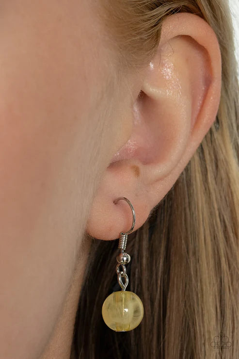Flat silver beads fade into cloudy yellow stone beads as they bow into a half moon at the bottom of a curved silver bar, creating an ethereal pop of color at the bottom of an extended silver chain. Features an adjustable clasp closure.