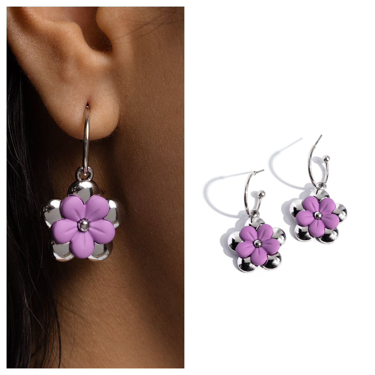 A small, skinny, silver hoop curves around the ear in a timeless fashion. A silver ball is affixed to the end of the hoop, reminiscent of a barbell fitting. A lavender acrylic flower with a silver beaded center blooms atop a metallic silver flower charm that slides along the curvature of the hoop, adding a subtle hint of whimsical movement. Earring attaches to a standard post fitting. Hoop measures approximately 1/2" in diameter.