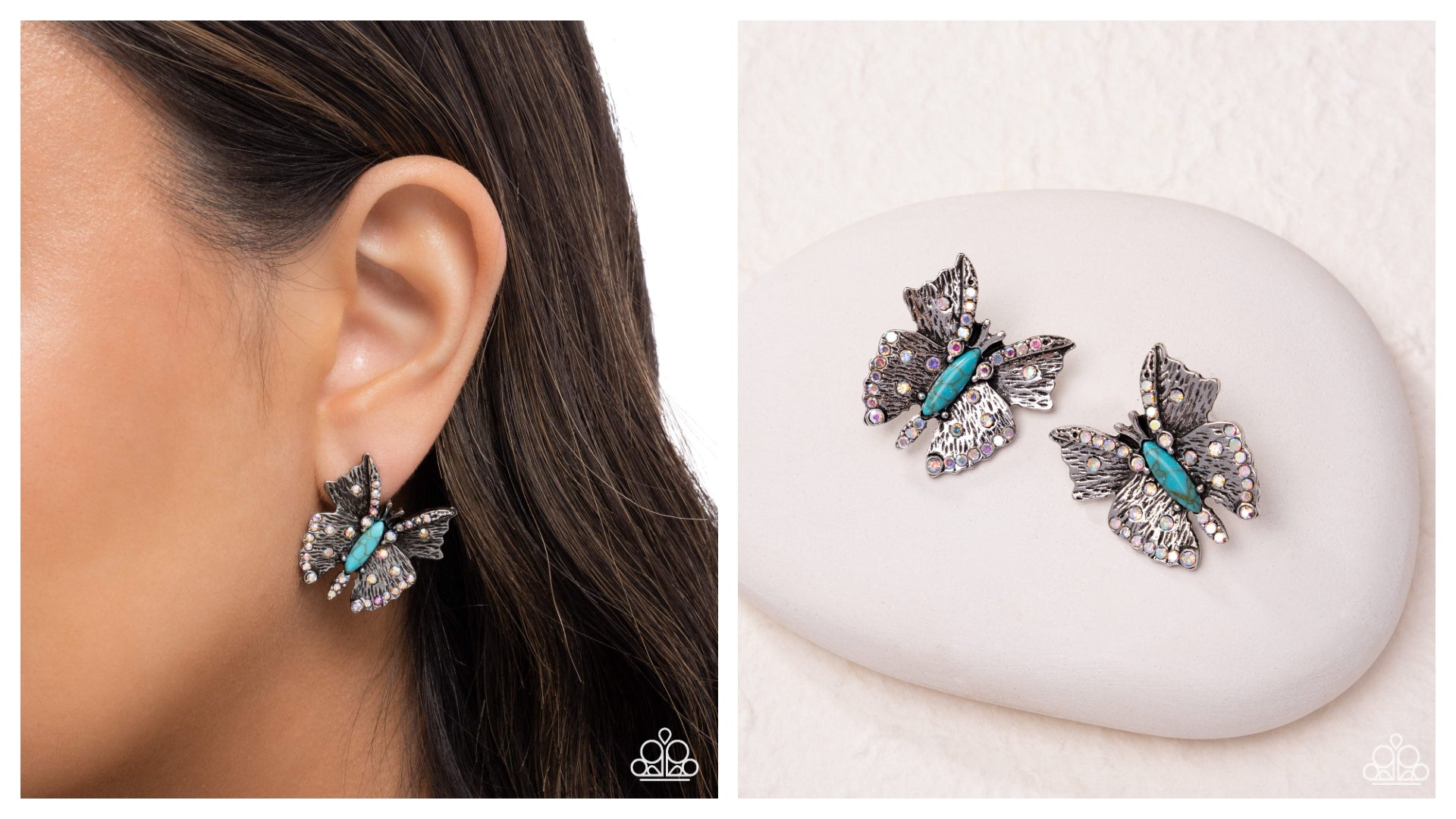 Sporadically dotted with iridescent rhinestones, a turquoise-stoned silver butterfly with textured, hammered wings flutters atop the ear for a fluttering fantastical display. Earring attaches to a standard post fitting. As the stone elements in this piece are natural, some color variation is normal. Due to its prismatic palette, color may vary.