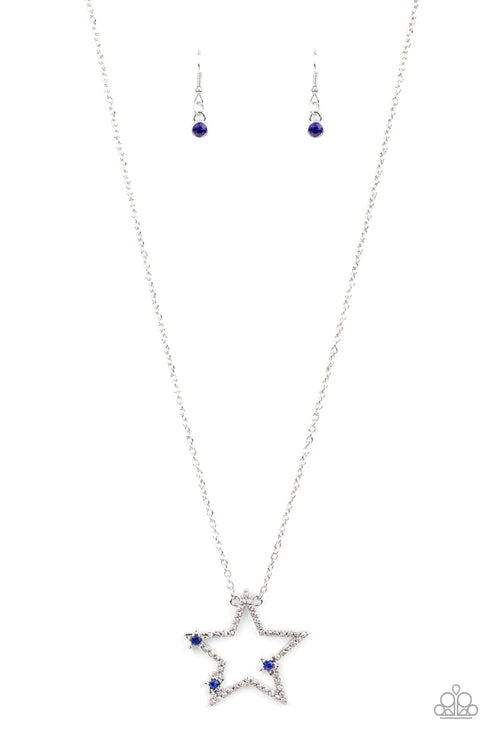 Dotted with glassy blue rhinestone centers, a dainty trio of silver stars haphazardly dots the front of a white rhinestone encrusted silver star pendant for a stellar patriotic look. Features an adjustable clasp closure.
