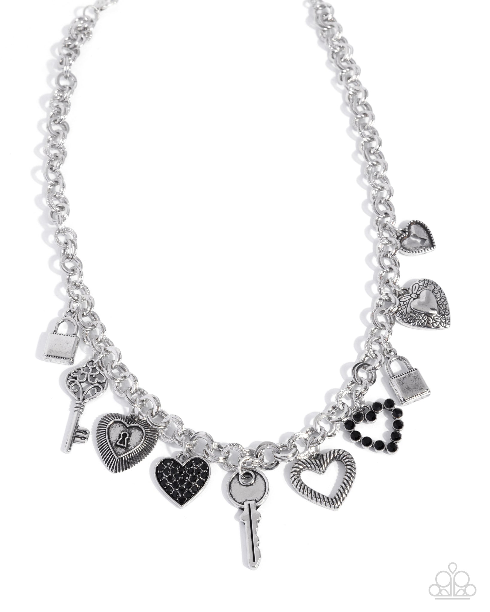 Necklace: Dotted with black rhinestones, an assortment of romantic charms, including various silver keys, silver padlocks, and varying textured and high-sheen silver hearts, sway along an abstract, hammered, layered link chain for a vintage finish. Features an adjustable clasp closure.