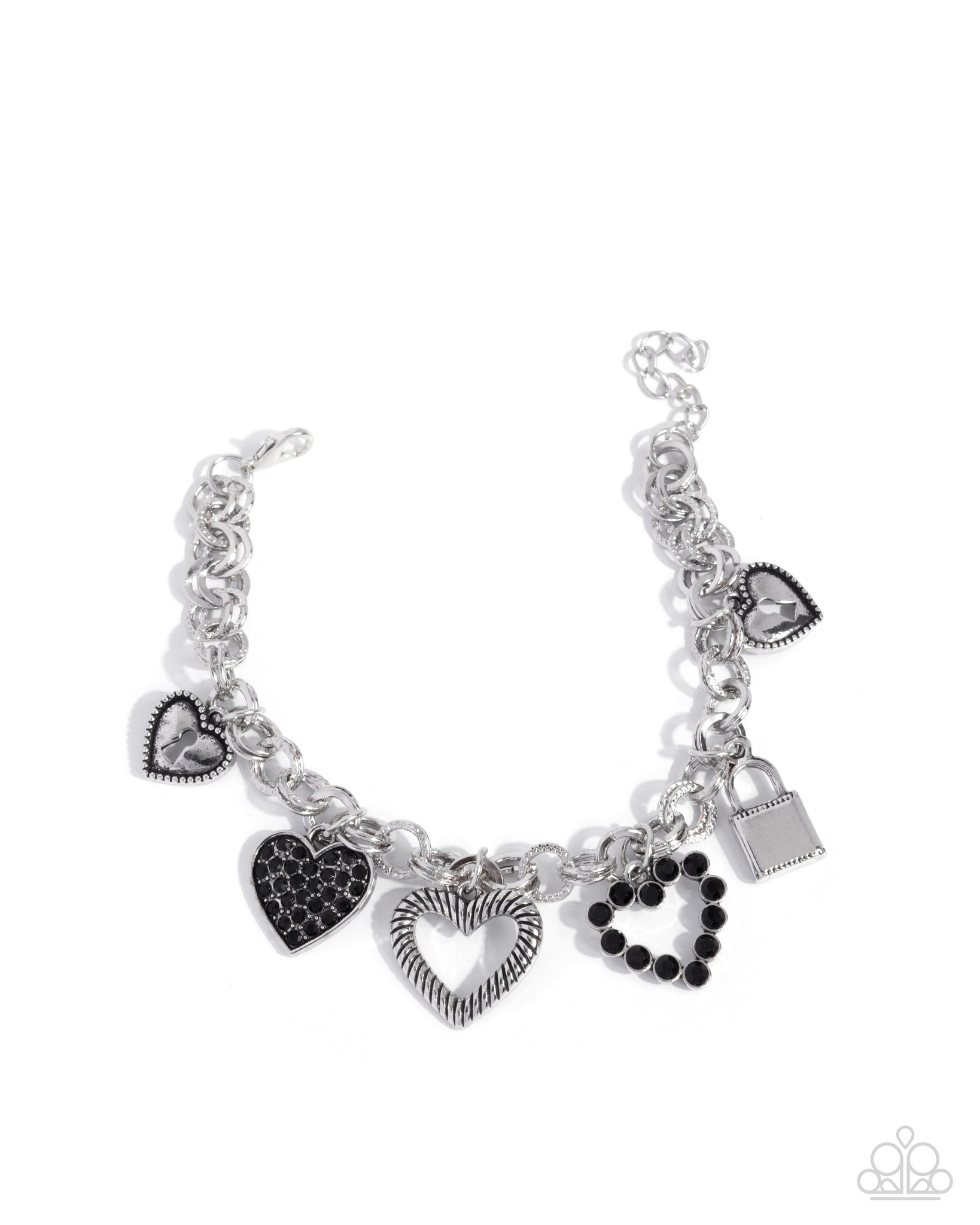 Bracelet: Dotted with black rhinestones, an assortment of romantic charms, including silver padlocks, and varying textured and high-sheen silver hearts, sway along an abstract, hammered, layered link chain for a vintage finish. Features an adjustable clasp closure.