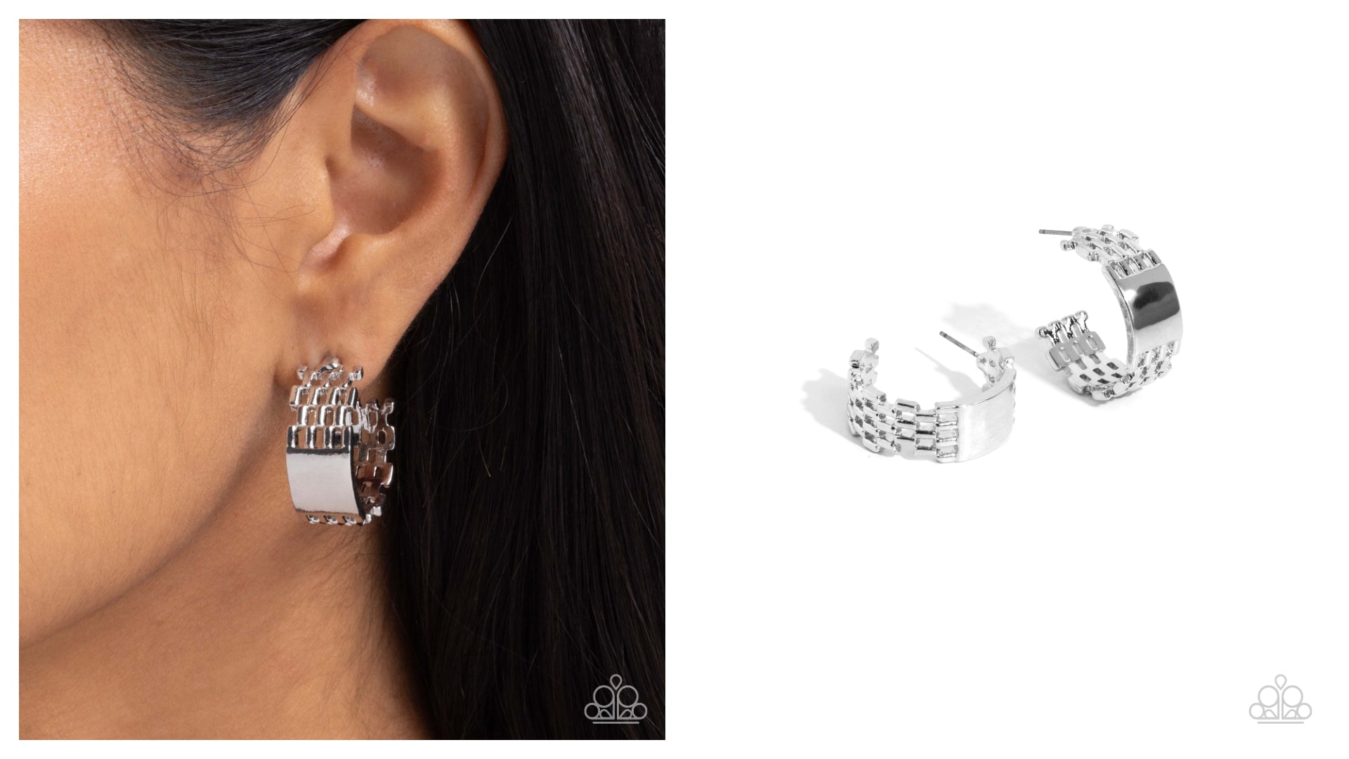 Featuring an industrial, belt-inspired pattern, a silver hoop streams out from both ends of a solid reflective silver rectangular center for an iconic, edgy look. Earring attaches to a standard post fitting. Hoop measures approximately 1" in diameter.