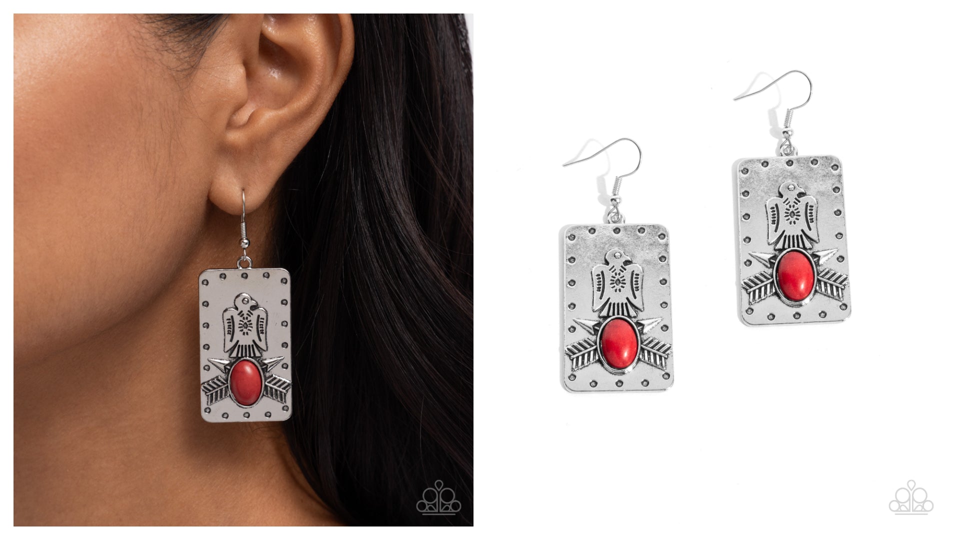 Stamped in Southwestern motifs and a red oval stone, an elongated silver rectangular pendant cascades below the ear for a standout statement. Earring attaches to a standard fishhook fitting. As the stone elements in this piece are natural, some color variation is normal.