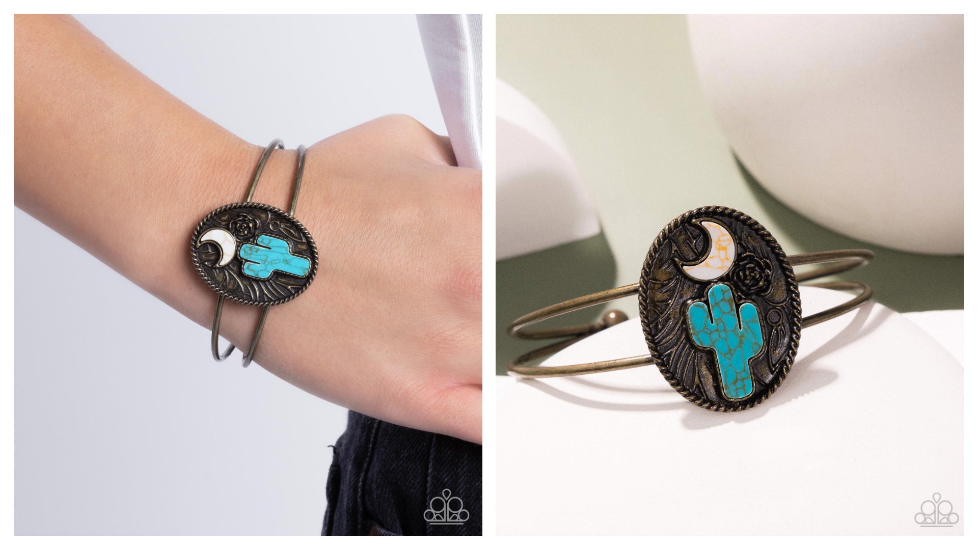 Featuring rustic textures, an oversized brass oval frame rests atop an airy brass cuff, creating an eye-catching centerpiece. A white stone crescent moon, a turquoise stone cactus, and a brass rosette are pressed inside the rope-textured brass frame for additional earthy detail. As the stone elements in this piece are natural, some color variation is normal.
