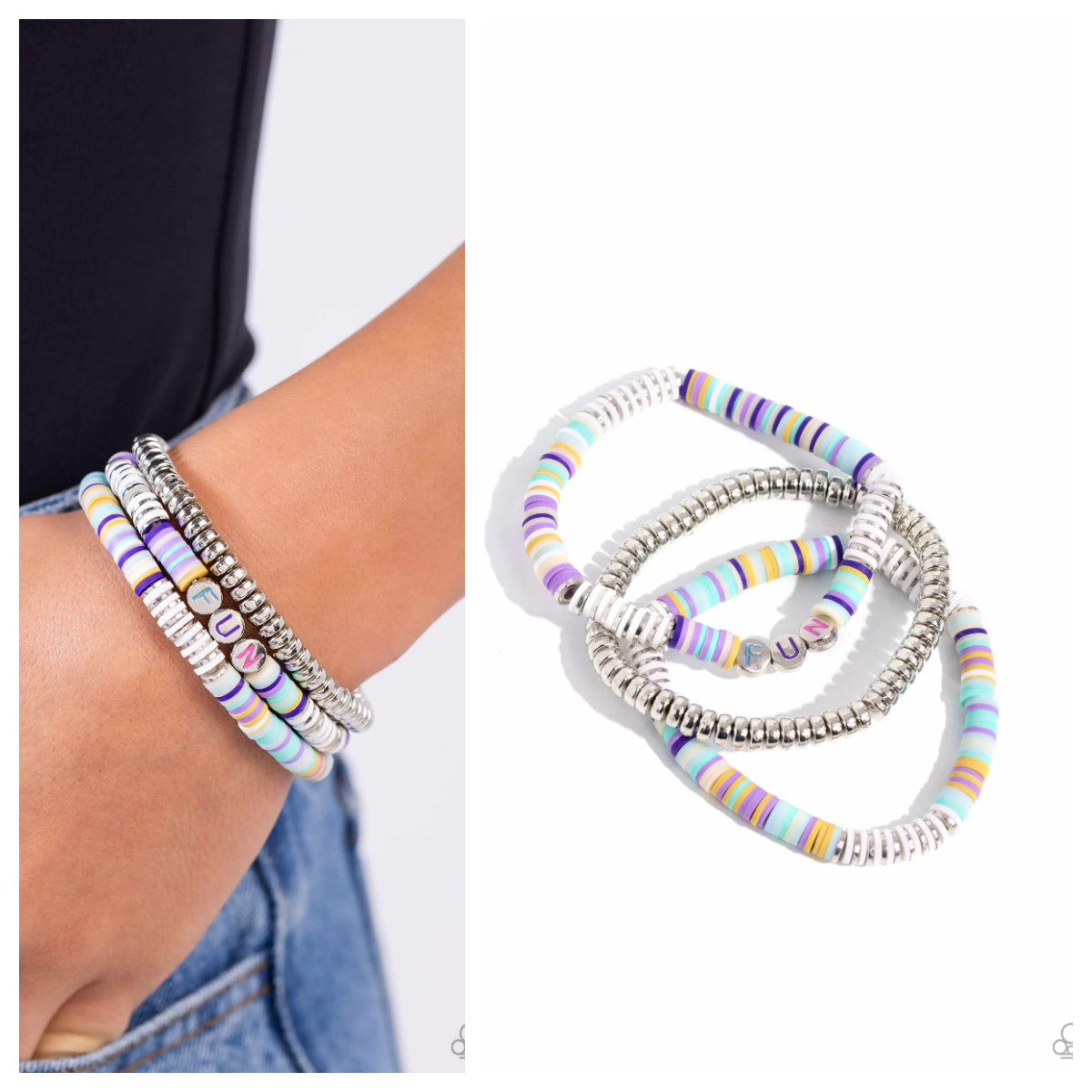 Colorful clay discs with silver discs combine with a strand of silver beads for a dramatic pop of color along the wrist on stretchy bands. Infused along one of the multicolored stacks, silver beads with turquoise, pink, and purple-painted letters spell out the word "FUN," adding a carefree finish to the design.