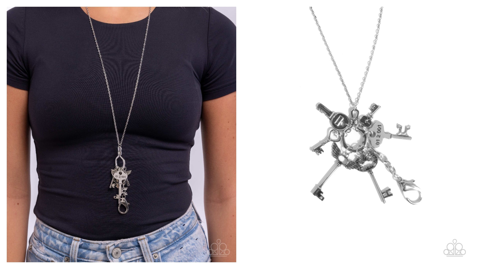 A vintage-inspired collection of keys swings from the bottom of a silver chain for a whimsical display. A lobster clasp hangs at the bottom of the design to allow a name badge or other item to be attached. Features an adjustable clasp closure.