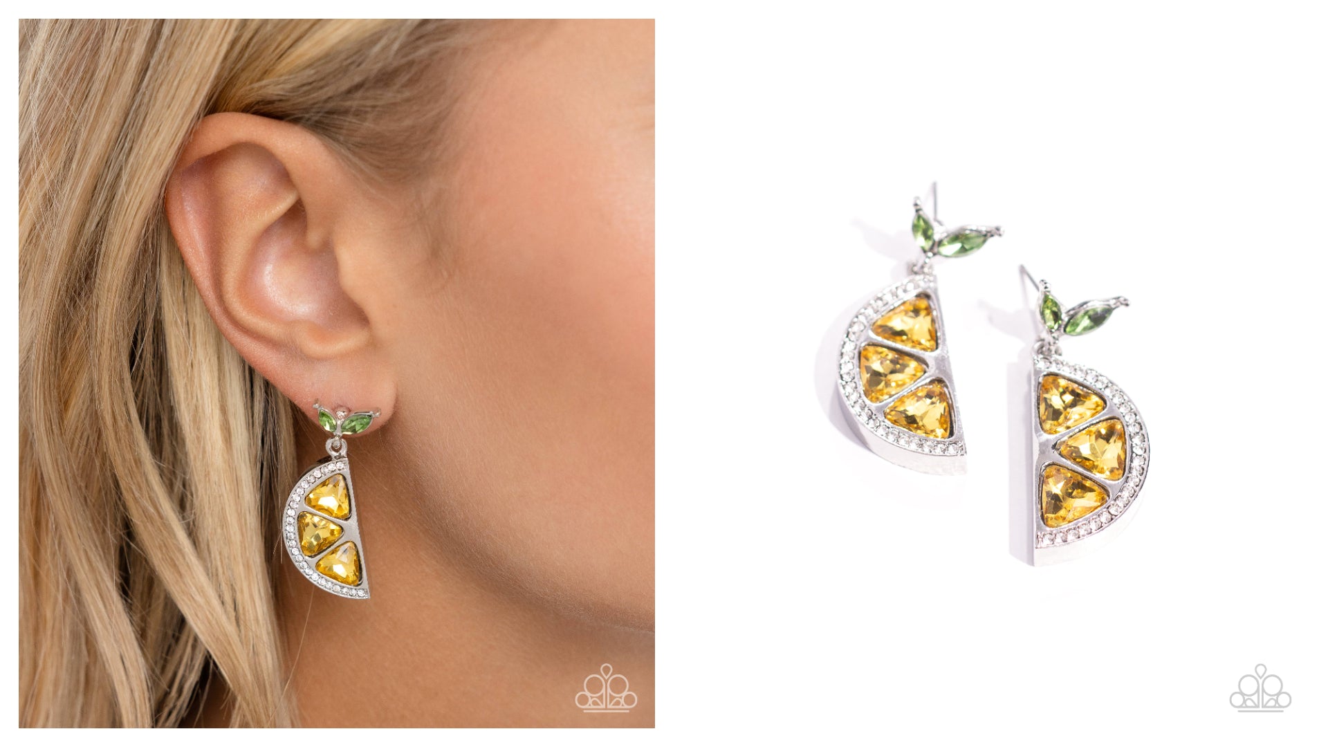 A duo of green marquise-cut gems in varying sizes give way to a lemon-like pendant formed from a trio of yellow triangular-cut gems. A row of glistening white rhinestones also forms along the rind of the lemon for a touch of sparkle. Earring attaches to a standard post fitting.