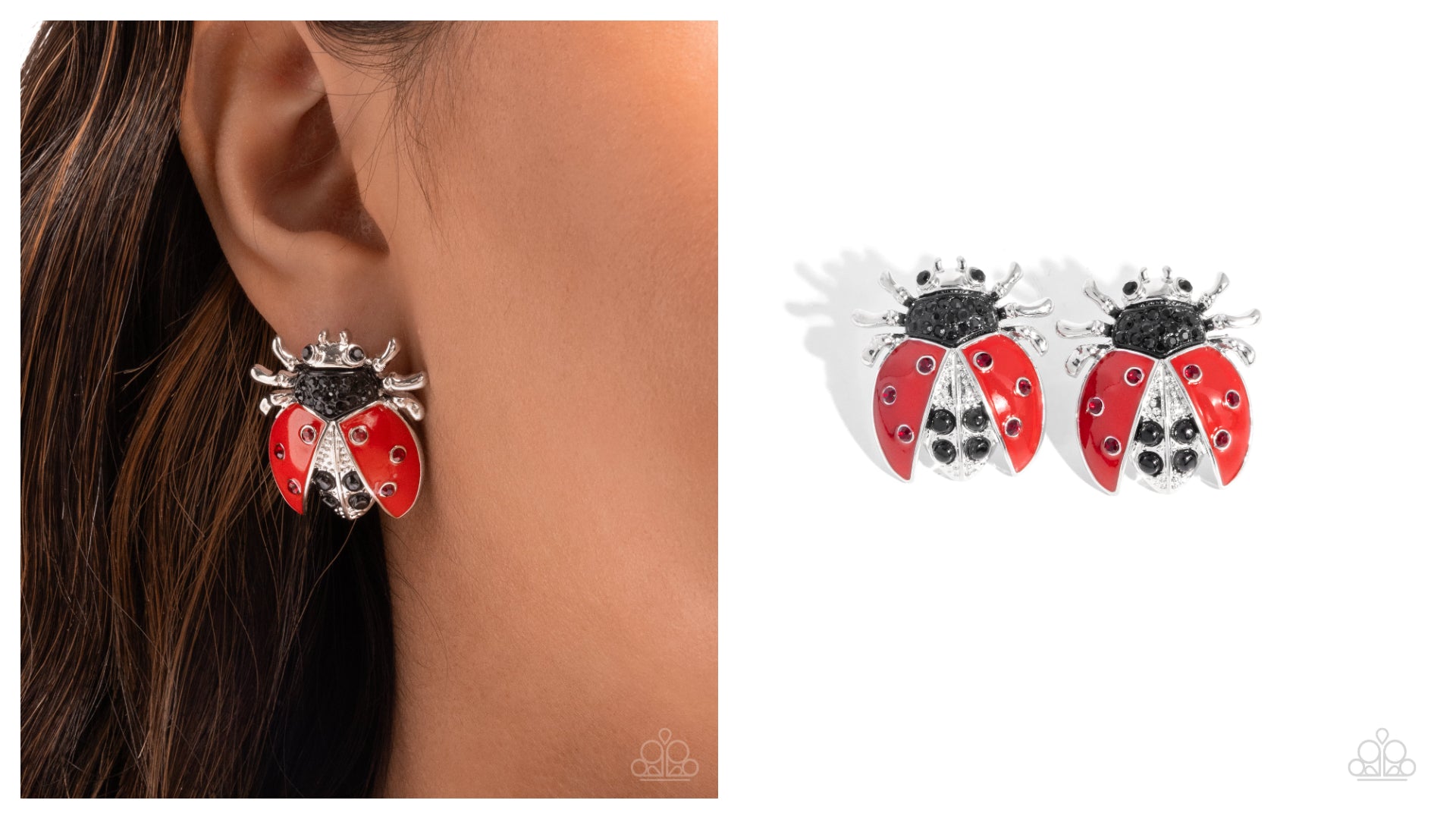 Showcasing a whimsical ladybug design, the vibrant design is perfect for adding a touch of playful charm to any outfit. The ladybug's bright red-painted wings are adorned with red rhinestone dots, creating an artistic representation of the beloved insect. Intricate silver details outline the wings and body, while the textured black rhinestones on the head provide an extra element of sparkle. Earring attaches to a standard post fitting.