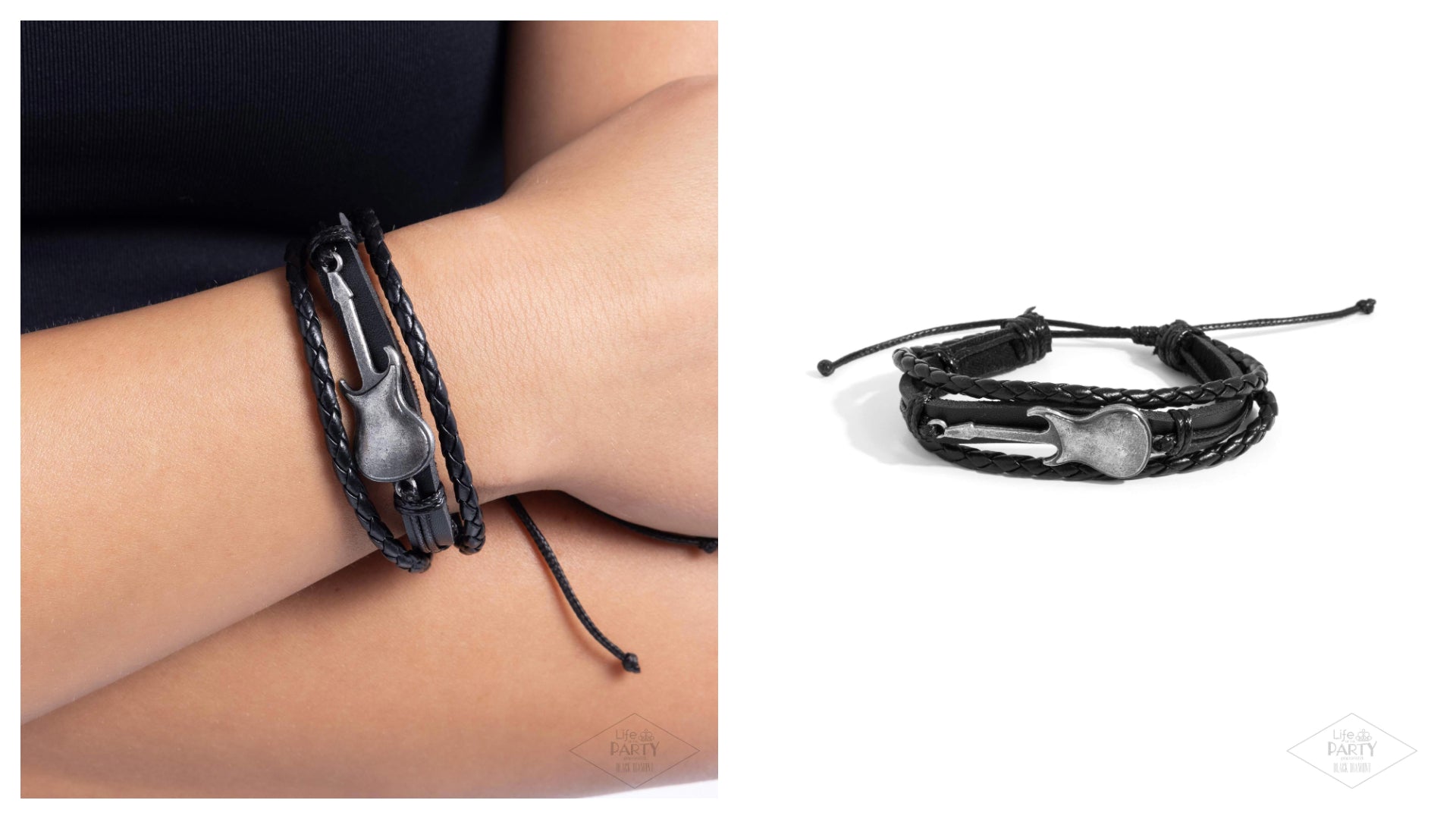 Two strands of braided leather cording join a rustic black leather band around the wrist. Shiny black cording wraps around a metallic guitar charm, knotting the centerpiece in place for an urban finish. Features an adjustable sliding knot closure.