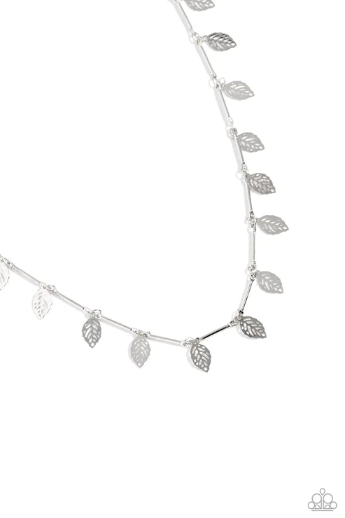 Skinny silver bars link together along the collar to create a dainty display of metallic sheen. A shiny silver leaf separates each bar, bringing shimmery movement to the lightweight design. Features an adjustable clasp closure.