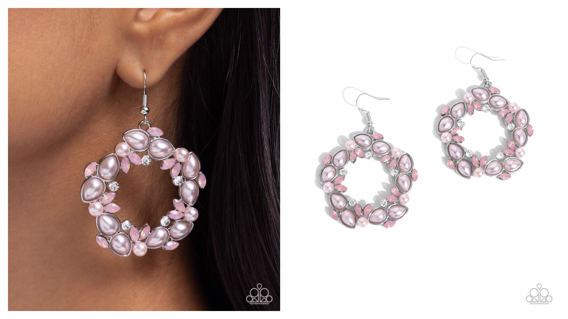A refined collection of baby pink pearl teardrop and round pearls joins round white rhinestones and opalescent pink marquise-cut gems, exploding across the front of a silver wreath, resulting in a geometric, jaw-dropping dazzle. Earring attaches to a standard fishhook fitting.