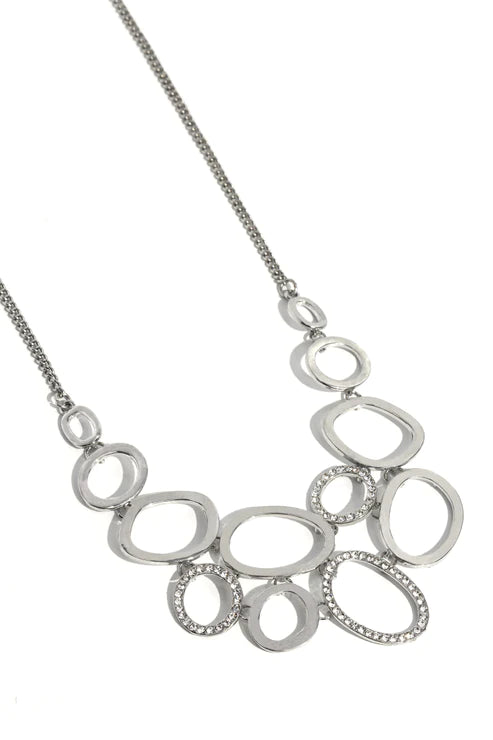 Oblong silver rings in varying sizes intermingle with oblong silver rings dusted with a border of white rhinestones for a sparkly monochromatic statement that cascades down the neckline from a classic silver chain. Features an adjustable clasp closure.