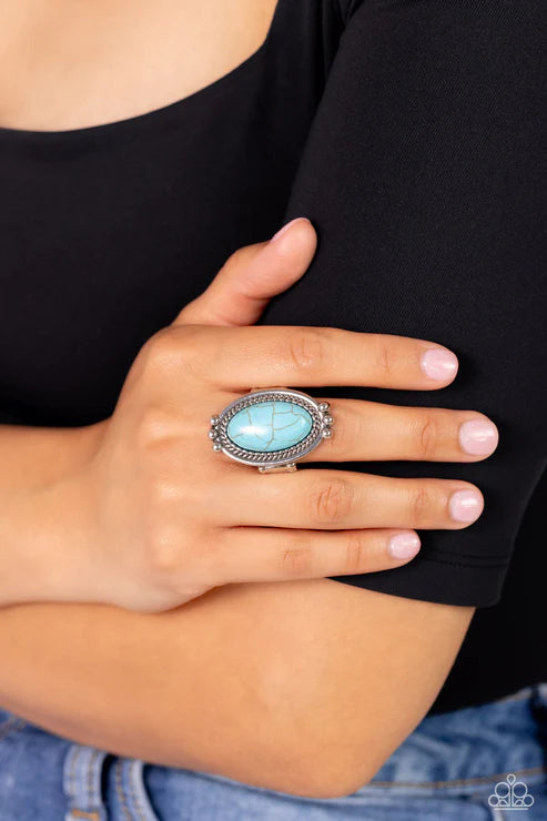 An oversized oval turquoise stone is pressed into the center of a studded silver frame that is bordered in rustic metallic rope-like texture, creating an earthy centerpiece atop the finger. Features a stretchy band for a flexible fit.