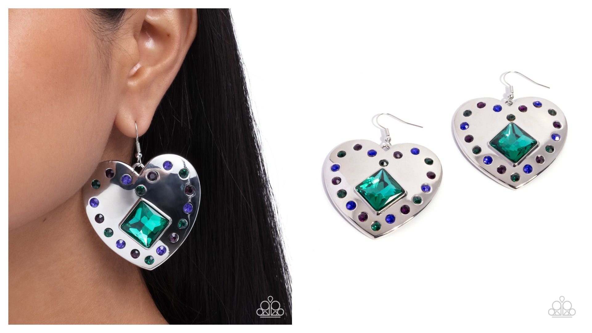 Lined with shimmery emerald, amethyst, and sapphire rhinestones, an oversized, high-sheen silver heart frame with an oversized tilted square emerald gem at its center dangles below the ear for a dazzling finish. Earring attaches to a standard fishhook fitting.