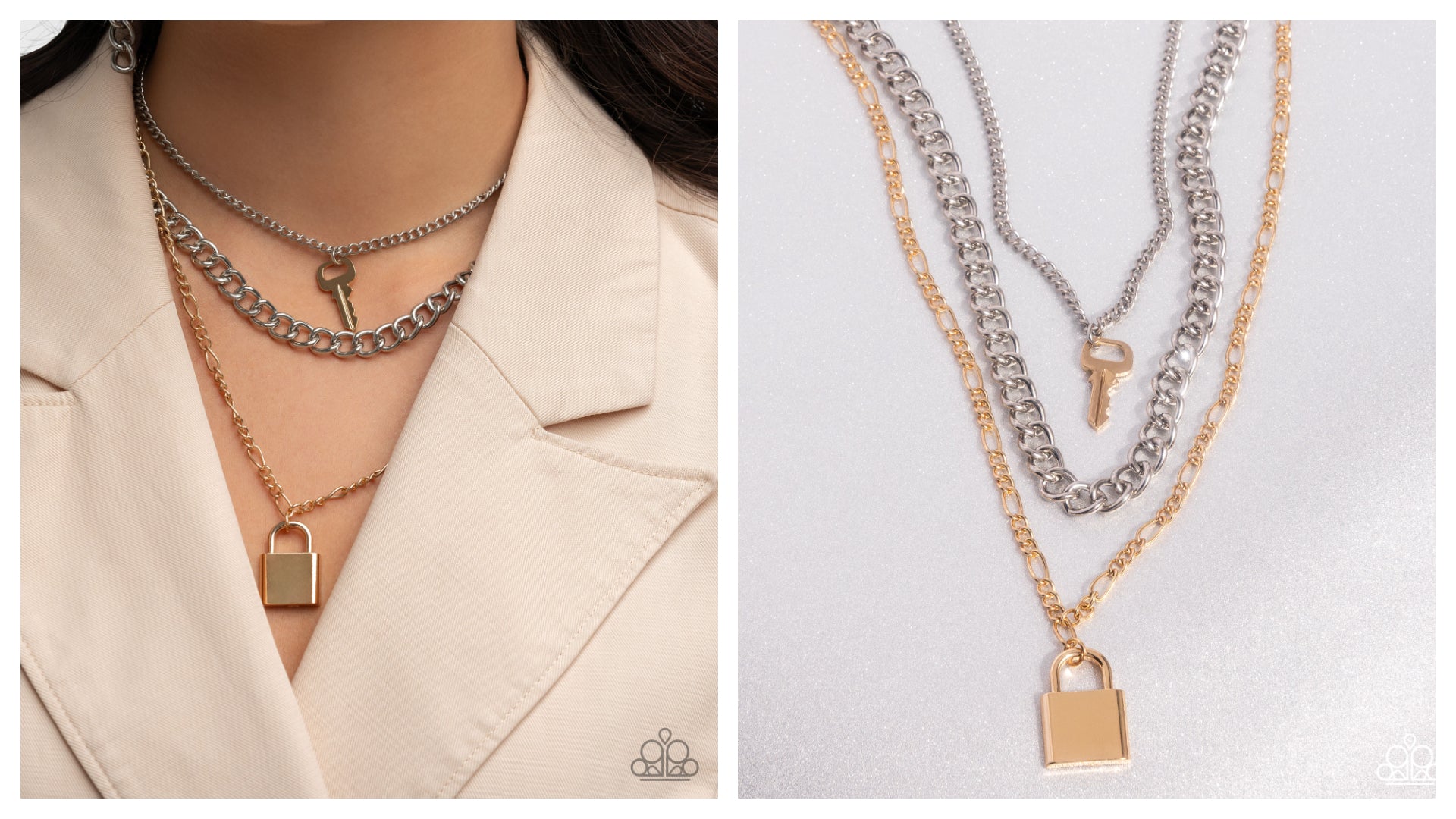 Three industrial silver and gold chains cascade in various lengths across the chest, creating a radiantly edgy display. The uppermost chain features a gold key charm, while a gold lock charm embellishes the lowermost chain creating a heavenly pendant at the bottom of the longest chain in a radiant finish. Features an adjustable clasp closure.