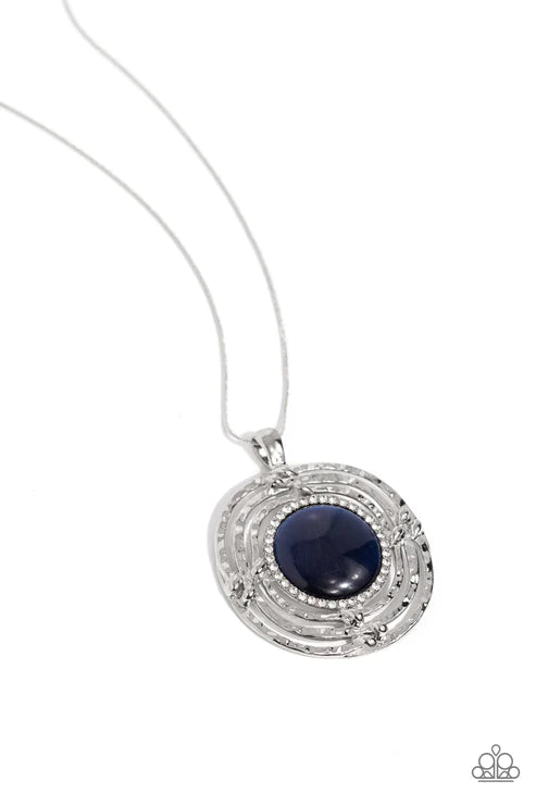 Rippling around an oversized navy cat's eye stone, hammered silver frames, with tilted silver accents, twist into three textured layers. A border of dainty white rhinestones dusts the navy cat's eye stone for a touch of glitz amongst the textured hoops. A dainty silver snake chain boosts the oversized labyrinth-styled pendant, further showcasing the exaggerated design. Features an adjustable clasp closure.