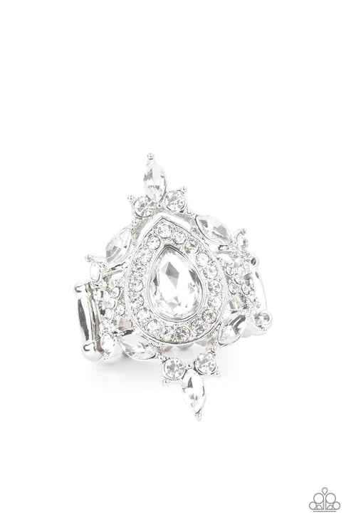 Featuring classic round and regal marquise cuts, dainty white rhinestones delicately join into a stellar frame. Encrusted in glassy white rhinestones, an oversized teardrop gem sits atop the center of a sparkly backdrop for a jaw-dropping finish. Features a stretchy band for a flexible fit.