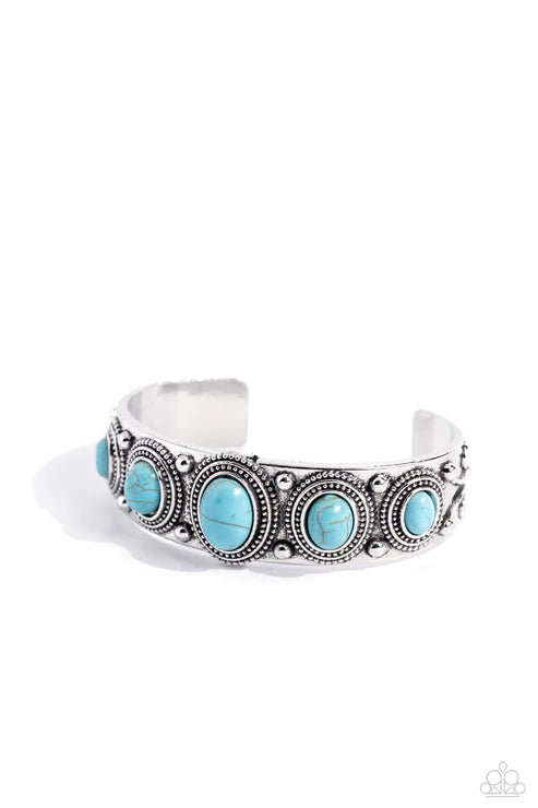 Bordered in rings of dainty silver studs, oval turquoise stones alternate with pairs of silver studs across the front of an antiqued silver cuff for a rustic fashion.