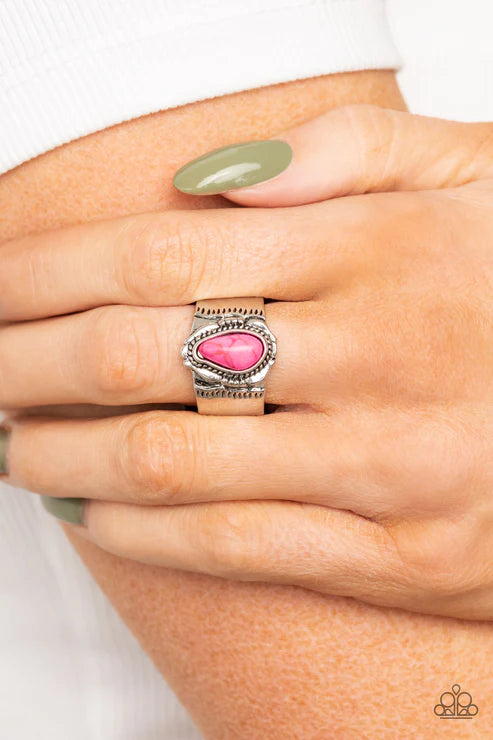 An asymmetrical pink stone adorns the center of a frame featuring spun silver details and folds of silver, resulting in a colorful artisan centerpiece atop a stamped silver band. Features a stretchy band for a flexible fit.
