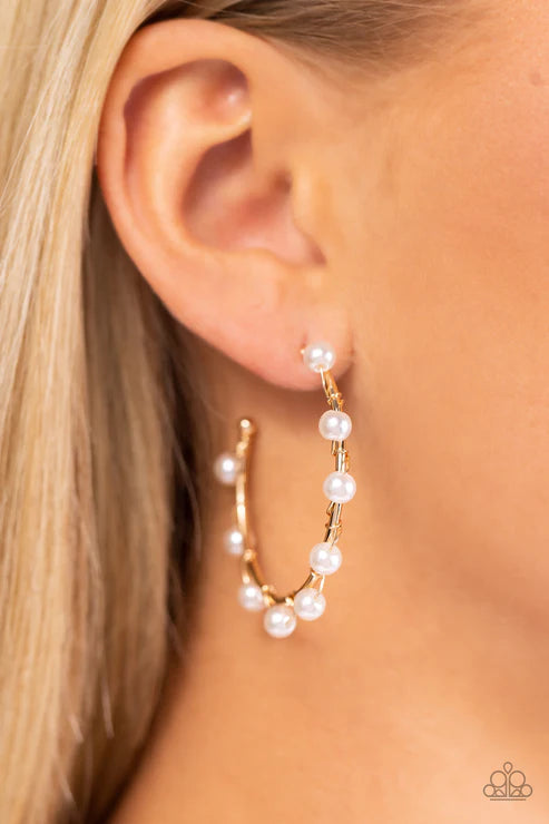 A classy collection of dainty white pearls are wrapped along the outside curve of a shiny, gold hoop by shimmery gold wire for a handcrafted, posh finish. Earring attaches to a standard post fitting. Hoop measures approximately 1 1/4" in diameter.